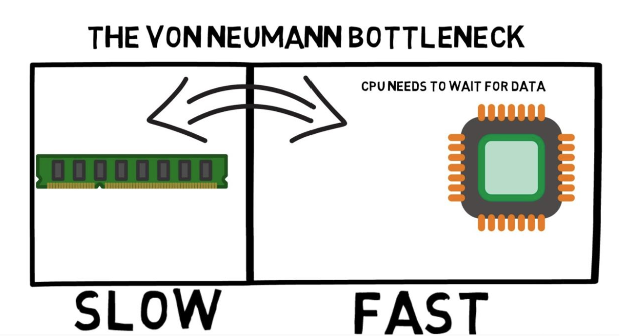 This bottleneck arises because the CPU and memory are physically separated and connected by a single data bus, which can only handle one data transfer at a time.